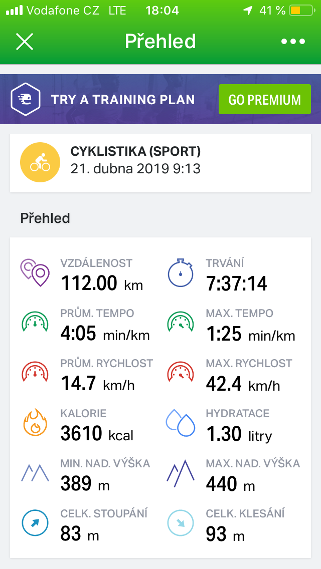 Odkaz na trasu cesty a podrobnosti jsou zde: https://www.endomondo.com/users/15030892/workouts/1304967110?fbclid=IwAR1CR5oye1i0V349Jr0Xg2nVRQ3vMGNhyLZmMM8UQ-PYEToIid-bvyAlRk4. Možná to půjde zobrazit pouze osobám, které májí stažené Endomondo.