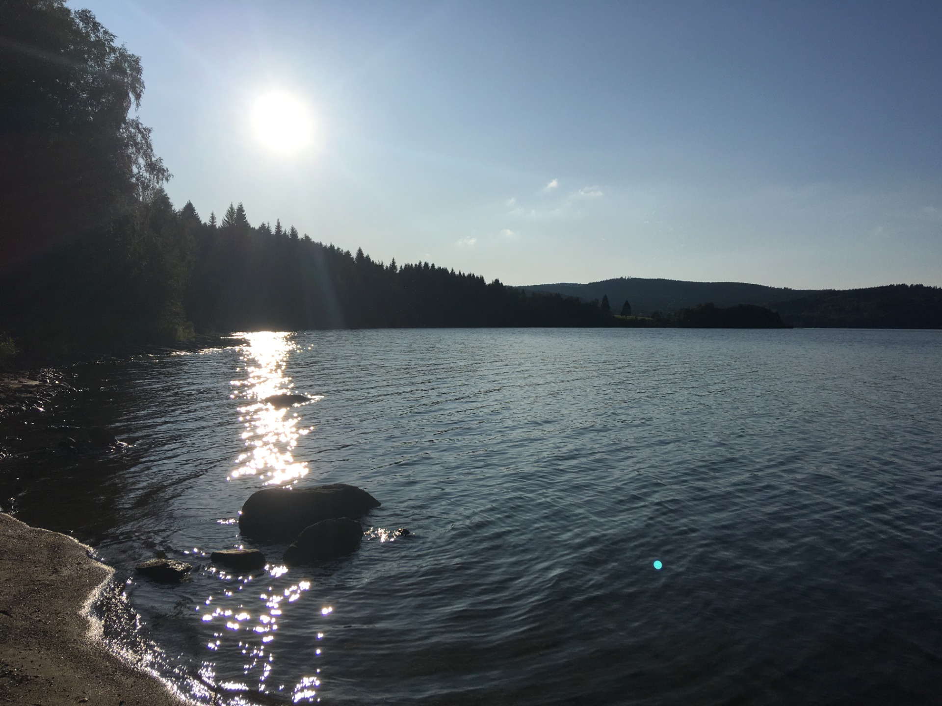 Hned asi po pěti kilometrech sjíždíme z kopce z hlavní cesty a přijíždíme k pláži, kde není žádná cesta - tohle byla naše dnešní první, klasická zajižďka. Takže se hezky do kopce vracíme zpět na hlavní cestu. Po hlavní cestě dojíždíme kousek od Kovářova, kde opět sjíždíme k břehu Lipna a tentokrát zdoláváme kus cesty přímo po písčito bahnité pláži. Na jednom místě se Juno snaží přeskočit malý přítok vody a jeho bílé boty se až po kotník zabořují v bahně :D. Po tomto zaboření následuje ještě kousek zdolání břehu a poté výjezd na hlavní cestu, po které se dostáváme přímo do Kovářova. V Kovářove, ve snaze vyhnout se hlavní silnici vedoucí do Černé v Pošumaví, sjíždíme opět k břehu Lipna, kdek zase jedem kousek po pláži, ale asi po kilometru se vracíme zpět do místa, ze kterého jsme sjeli k břehu - toto byla naše další zajížďka. Po hlavní silnici pokračujeme do Černé v Pošumaví a dále do Horní Plané, kde zastavujeme na nějaké malé jídlo.